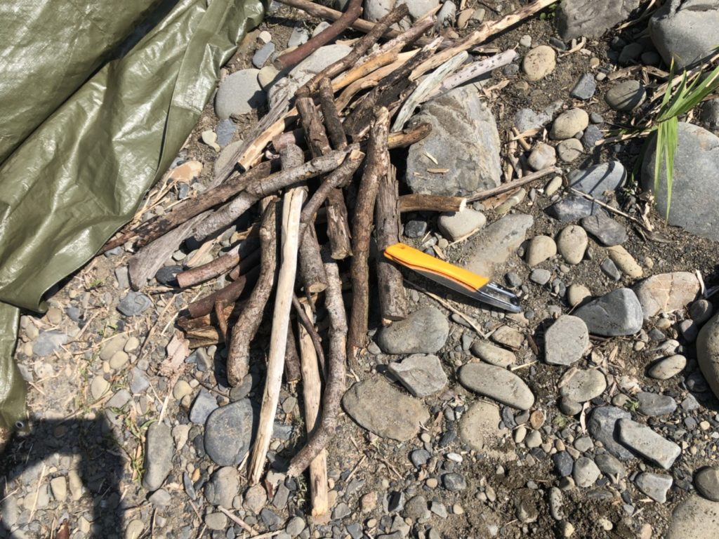 そのあたりにあった巻になりそうな乾燥した木材や流木を拾ってきて、のこぎりでカットし斧で薪割りしてストーブに入るサイズを作る