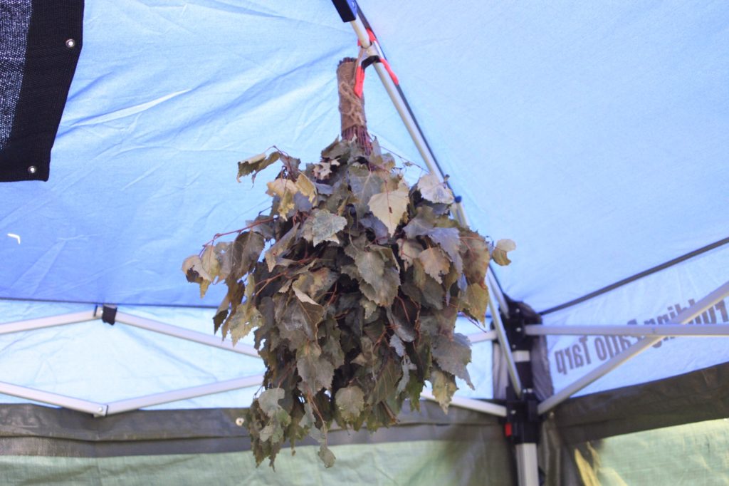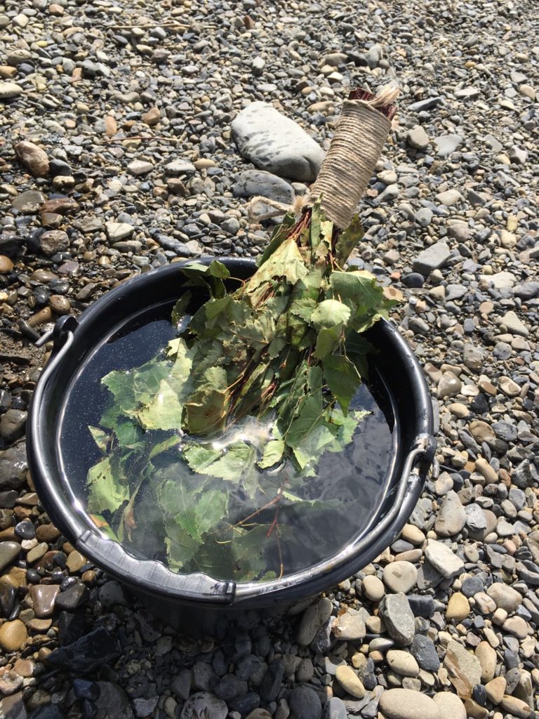 ヴィヒタ(白樺の木の葉っぱの束)を水に浸してサウナストーンへ川の水をかけて仰ぎます。