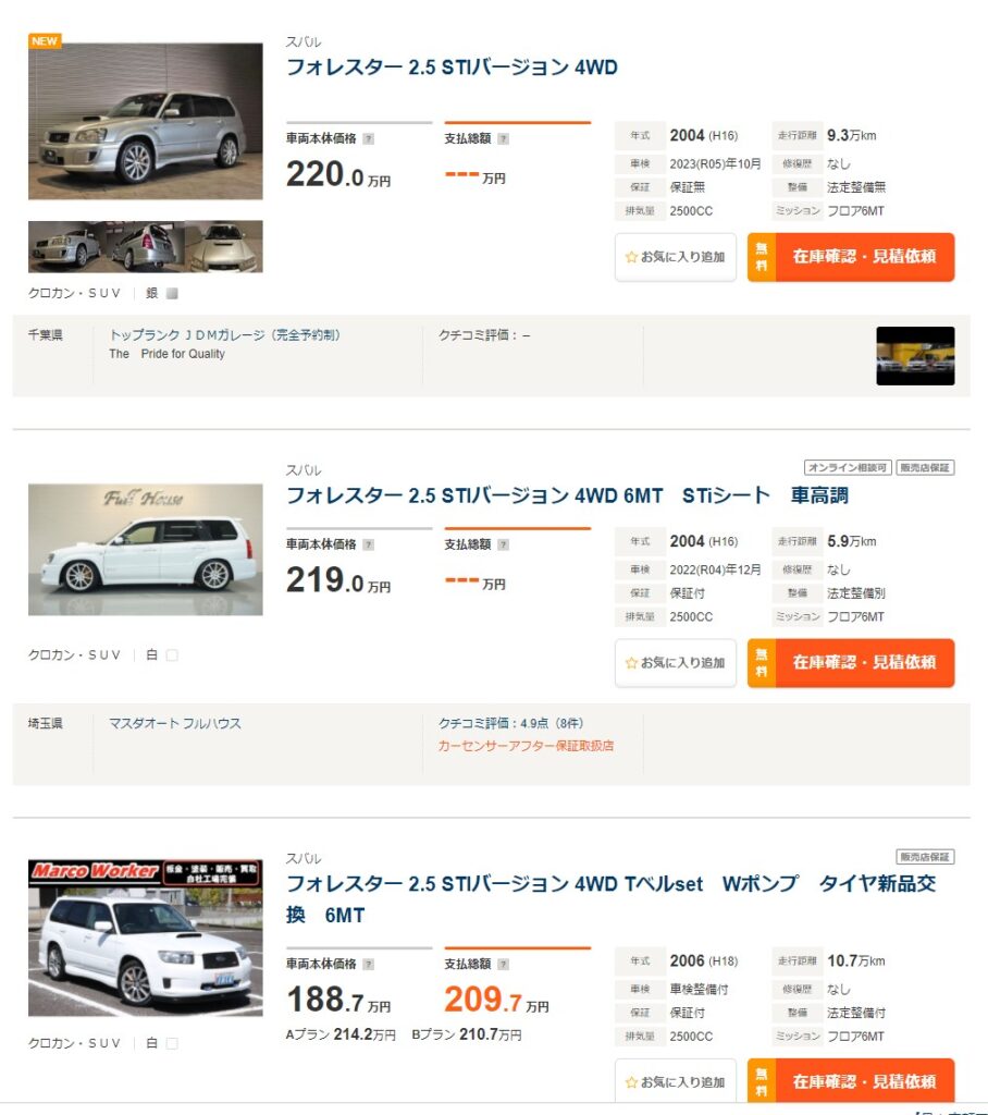 カーセンサーでの相場 2.5 STIバージョン 4WDでの絞り込み検索結果