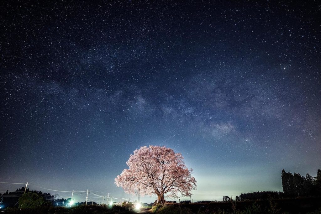 春の夜明けを待つ。新月の夜、大坪の一本桜に立ち上がる天の川